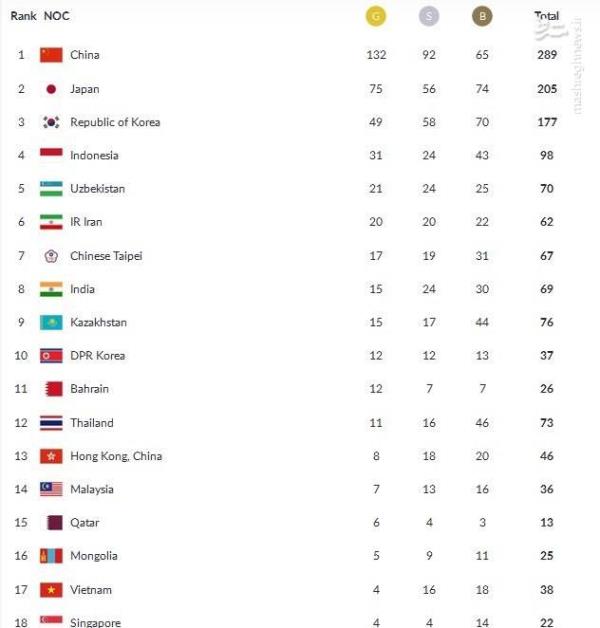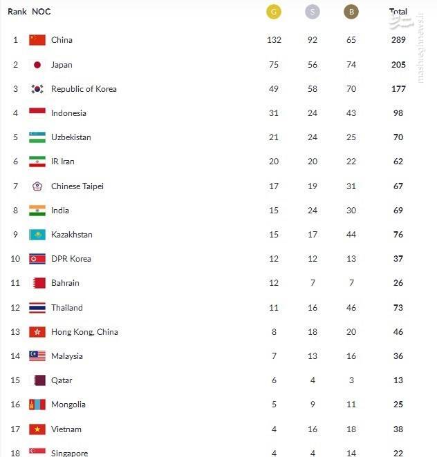 پایان رسمی بازیهای آسیایی ۲۰۱۸ جاکارتا +جدول نهایی